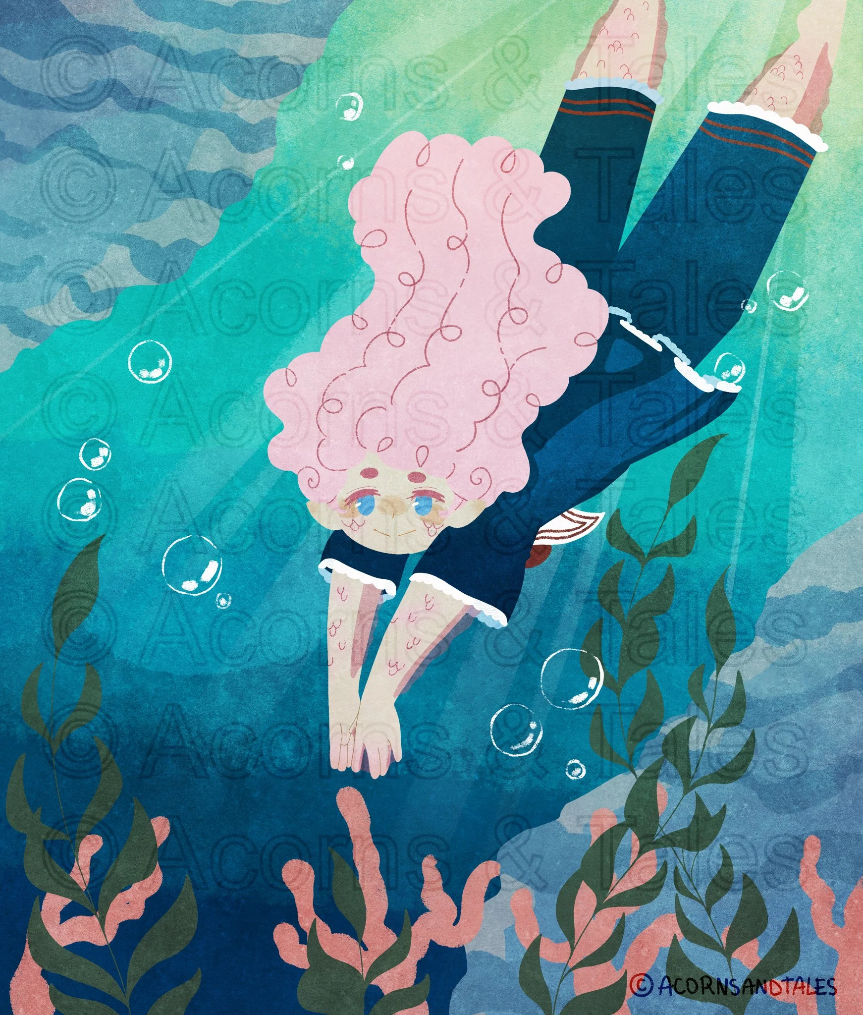 The main character, Scylla, in an underwater setting for a full-page illustration